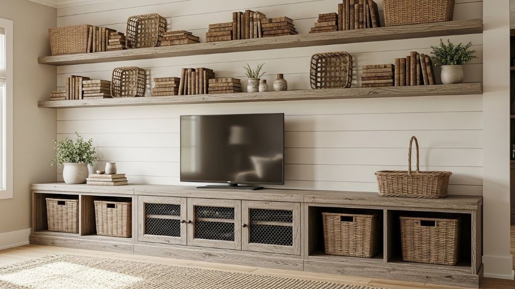 Built-in shelving painted in soft whites or creams provides farmhouse charm. Style them with baskets, vintage finds, and natural elements. This approach keeps the look organized yet casual.